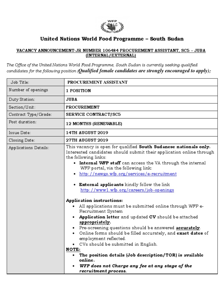 Vacancy Announcement The United Nations World Food Programme Wfp South Sudan Country 78963 79990 80262 80010 Pachodo Org